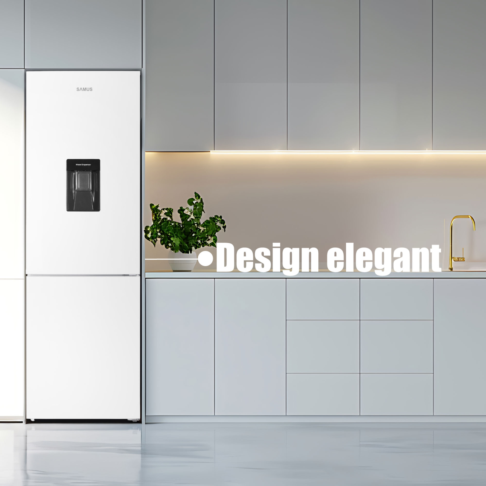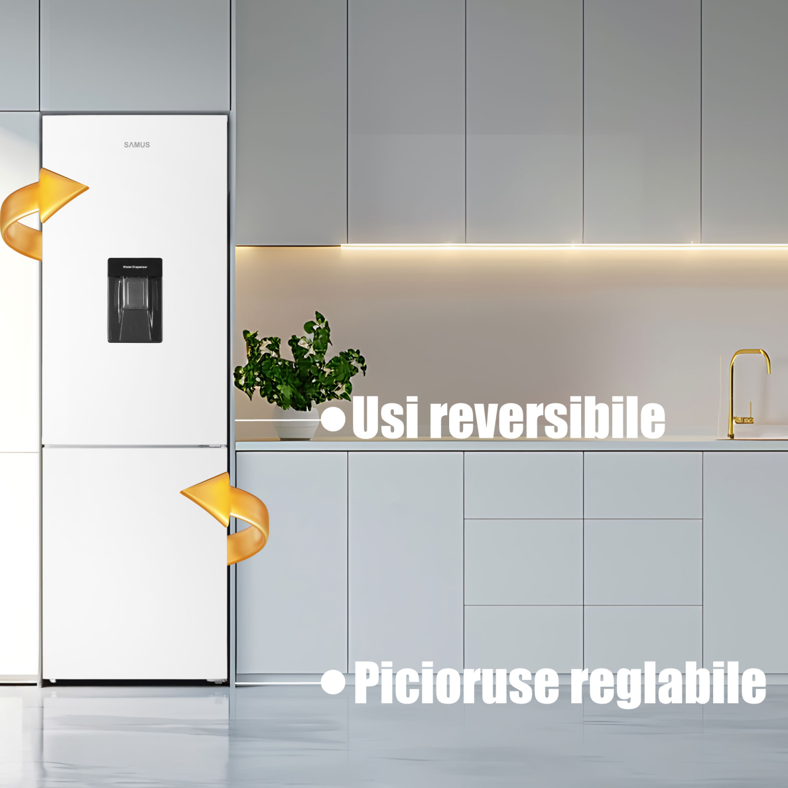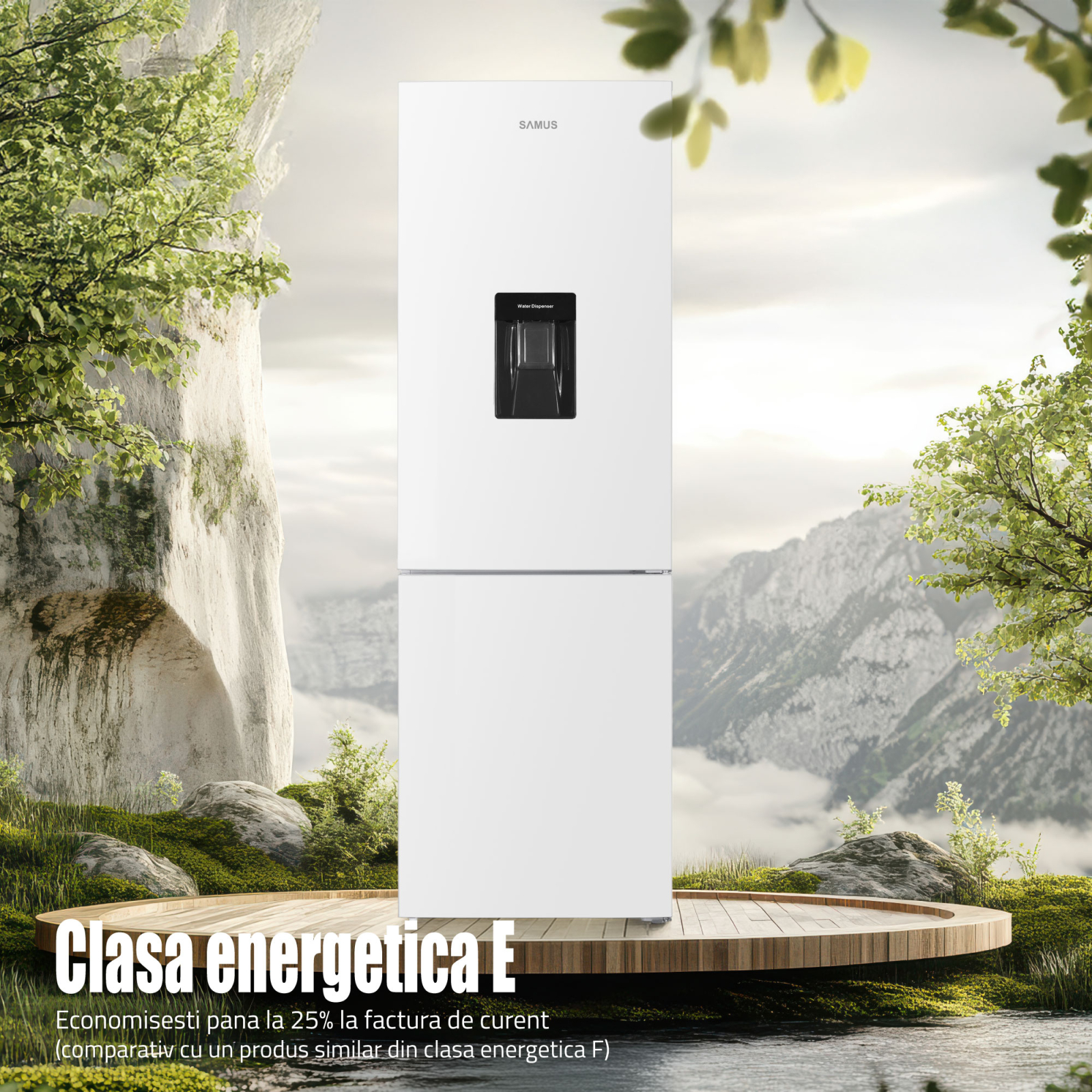 Samus Combina frigorifică Samus SCW396NFDE, 286 L net (210 L frigider + 83 L congelator), Full No‑Frost, dozator de apă, LED, clasa E, uși reversibile