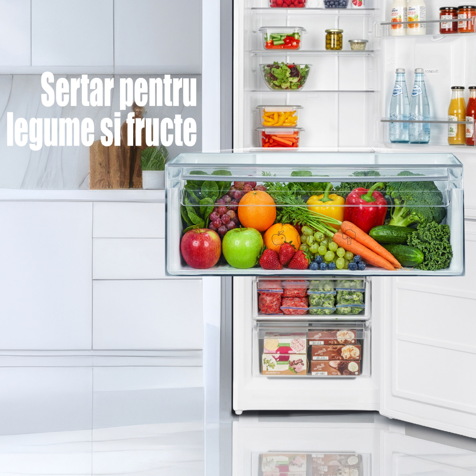 Ai tot timpul alimentele la vedere. Becul LED situat în partea superioara asigura vizibilitate maxima în orice colt al frigiderului.