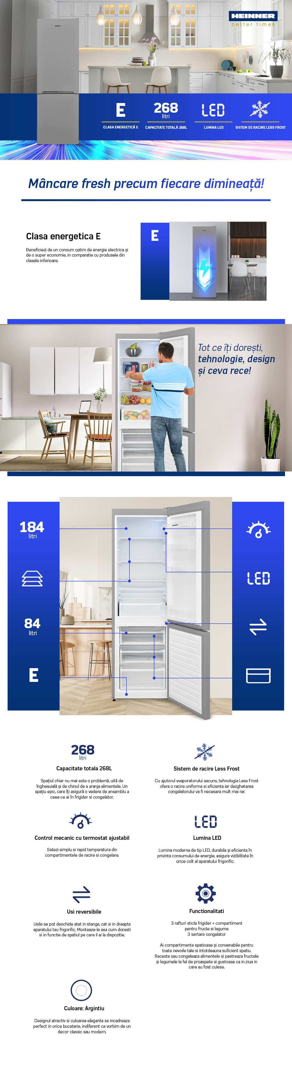Combina frigorifica Heinner HC-V2681SE++, 268 l, Less Frost, Clasa E, Control mecanic, Iluminat LED, H 170 cm, Argintiu