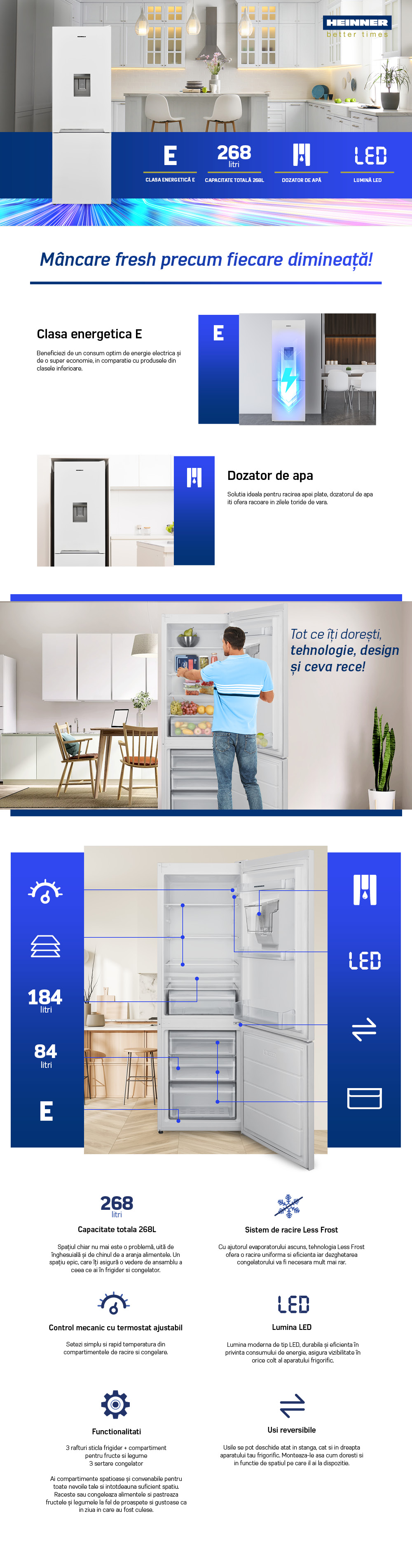 Combina frigorifica Heinner HC-V2701WDE++, 268 l, Clasa E, Dozator apa, Control mecanic, Iluminat LED, H 170 cm, Alb