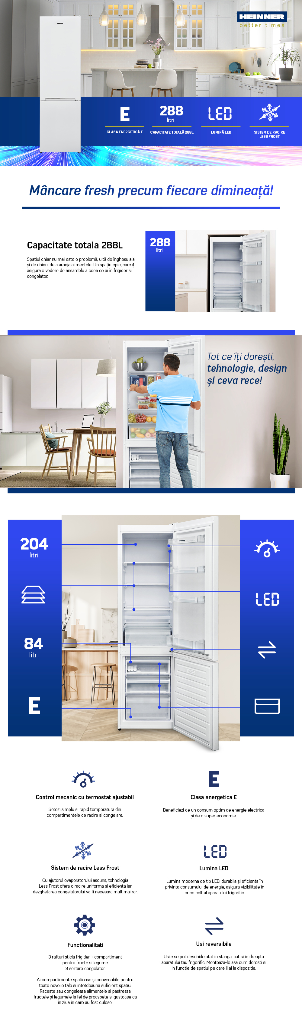 Combina frigorifica Heinner HC-V288E++, 288 l, Clasa E, Less Frost, Iluminare LED, Control mecanic, H 180 cm, Alb