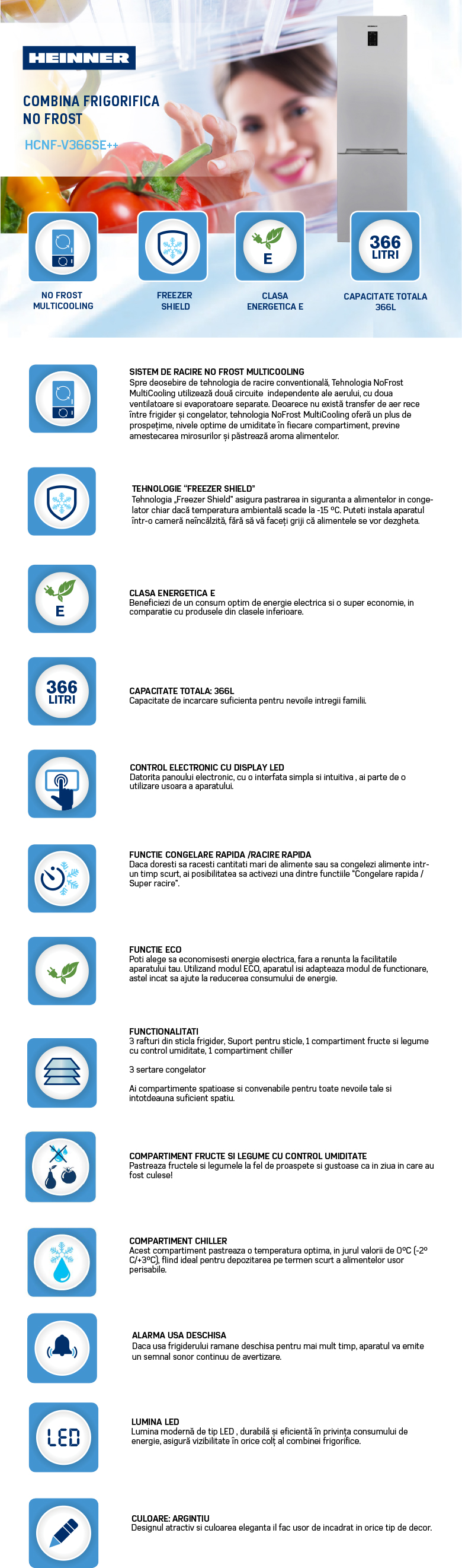 Combina frigorifica Heinner HCNF-V366SE++, 366 l, No Frost, Clasa E, Display, Control electronic, Iluminare LED, Alarma usa deschisa, H 201 cm, Argintiu