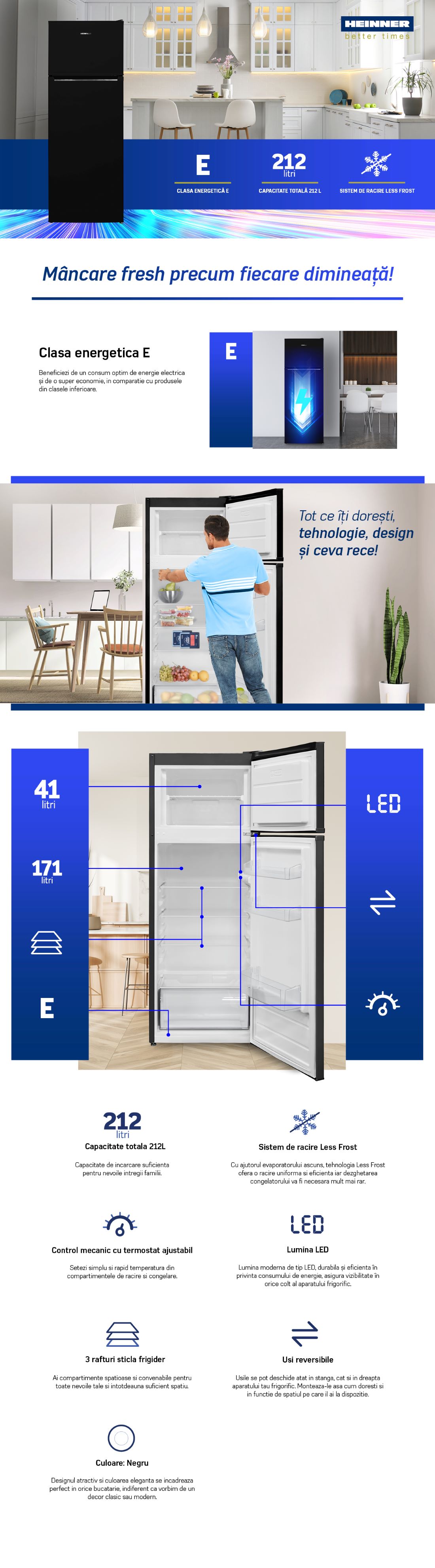 Heinner Frigider cu doua usi Heinner HF-V212BKE++, 212 l, Less Frost, Iluminare LED, Clasa E, H 144 cm, Negru