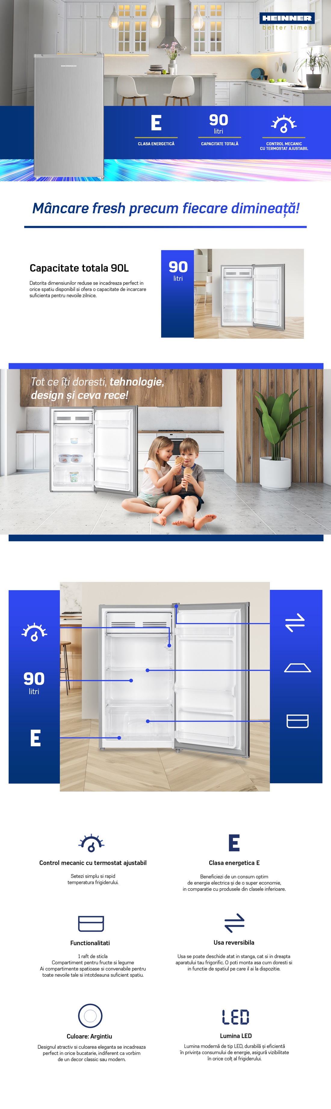 Heinner Frigider cu o usa Heinner HF-HM90SE++, 90 l, Clasa E, Iluminare LED, H 85 cm, Argintiu