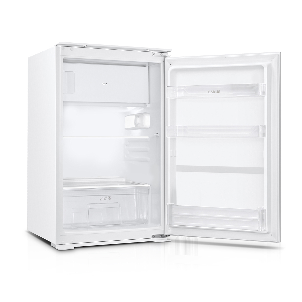Cu o capacitate de 118 litri (104 L frigider, 14 L congelator), frigiderul incorporabil Samus dispune de dimensiuni generoase care raspund cu incredere nevoilor tale si ale membrilor familiei. Frigiderul este inteligent compartimentat, pentru a putea depozita tot ceea ce ai nevoie. In interiorul acestuia se gasesc 2 rafturi din sticla rezistenta si 3 balcoane pe usa.