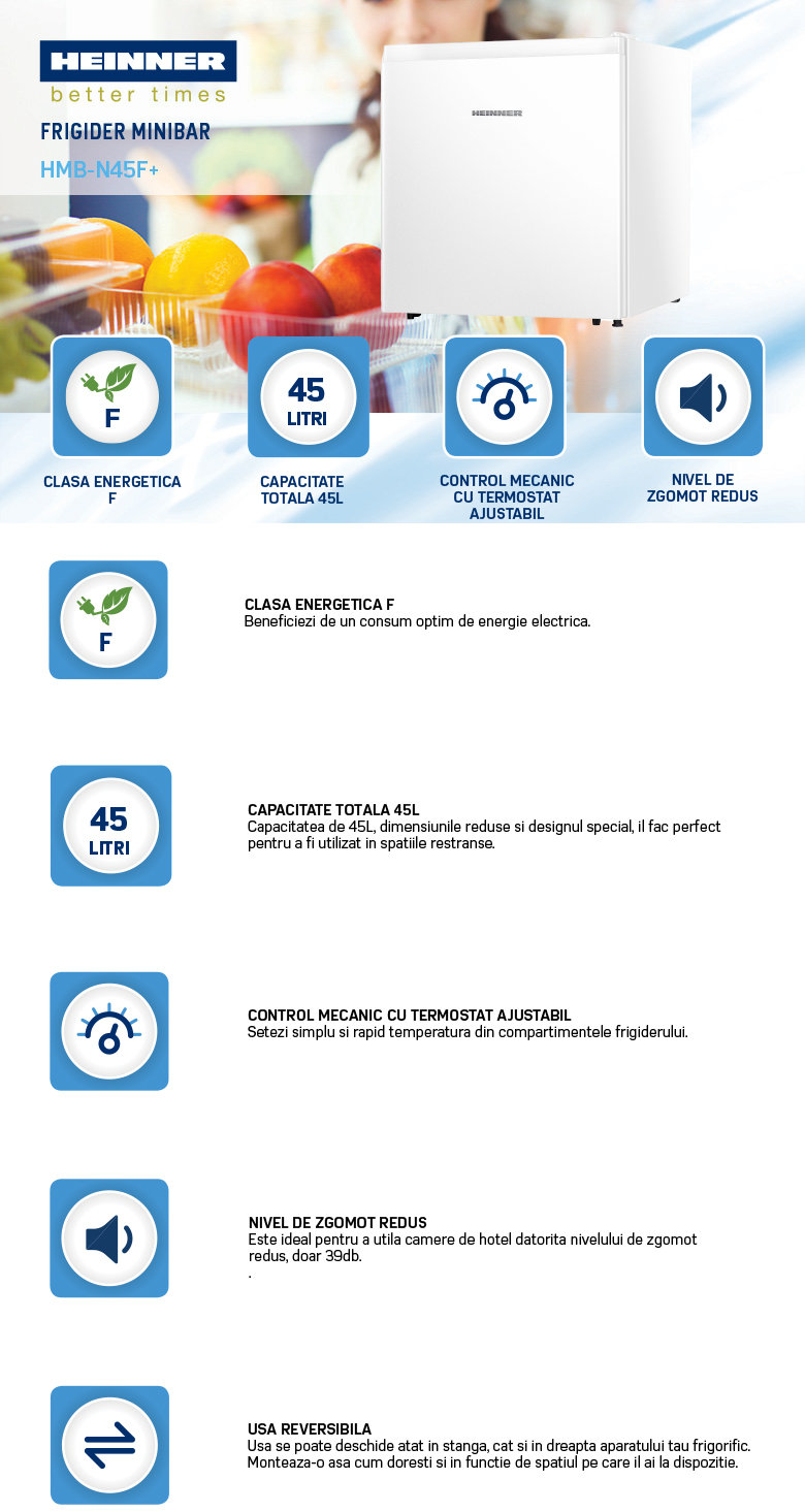 Heinner Frigider minibar Heinner HMB-N45F+, 45 l, Clasa F, Control mecanic cu termostat ajustabil, 1 raft din sticla, Usa reversibila, H 50 cm, Alb