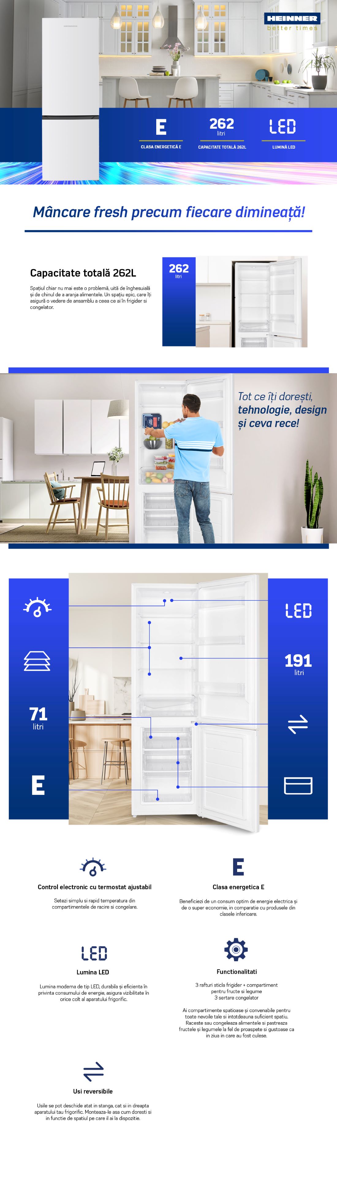 Heinner Combina frigorifica Heinner HC-HM262E++, 262 l, Control electronic, Usi reversibile, Clasa E, H 180 cm, Alb