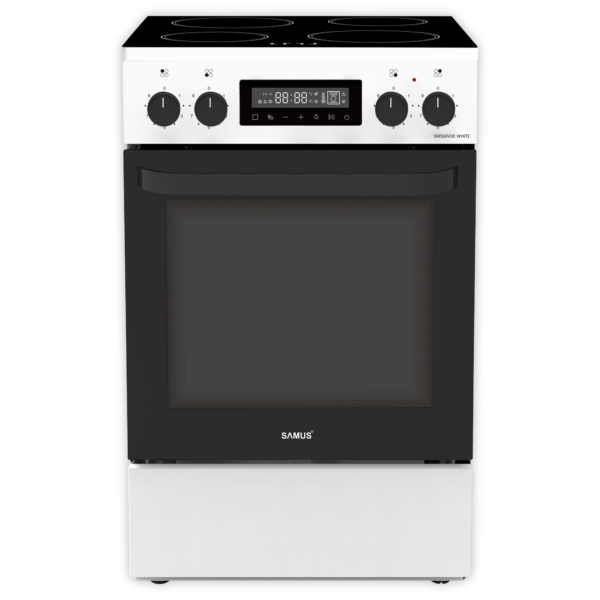 Aragaz Electric 50×60 cm, 4 Zone Vitroceramice, Cuptor 59L cu 11 Funcții, Clasa A, Alb – Grătar + Tavă + Air Fryer