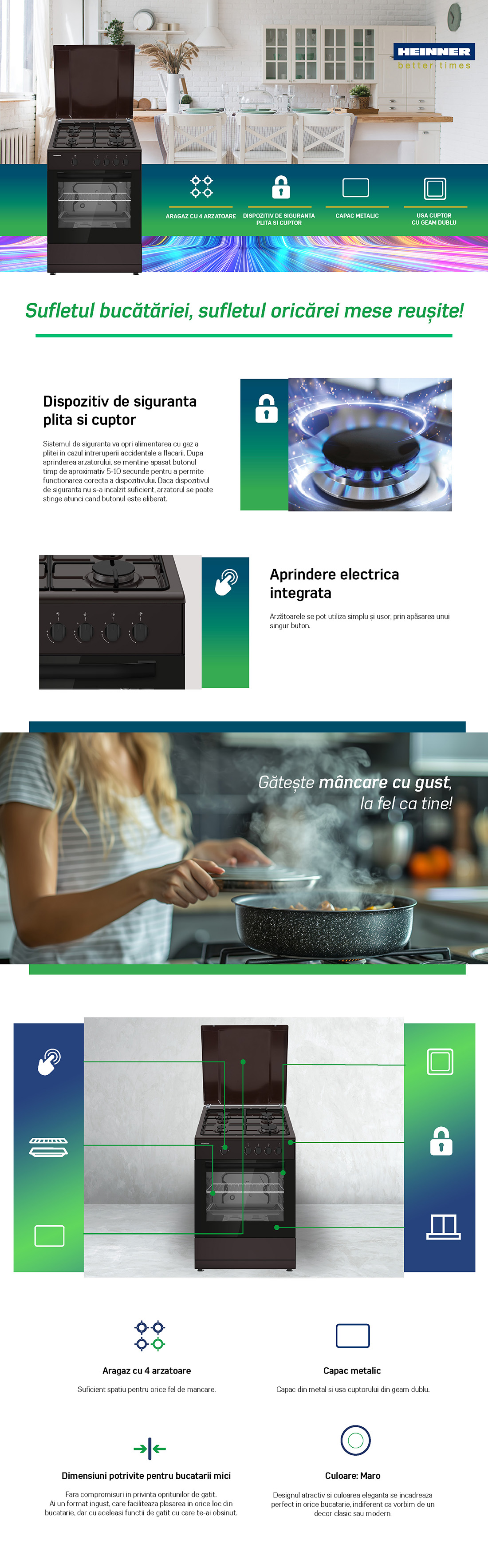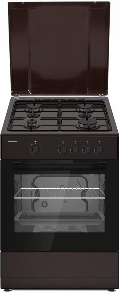 Heinner Aragaz HEINNER HFSC-SME66IBRW, Gaz, Suport email, Capac metalic, Aprindere electrica, Dispozitiv de siguranta plita si cuptor, Usa cuptor cu geam dublu, Duze GPL incluse, Tava si gratar cromat, Maro