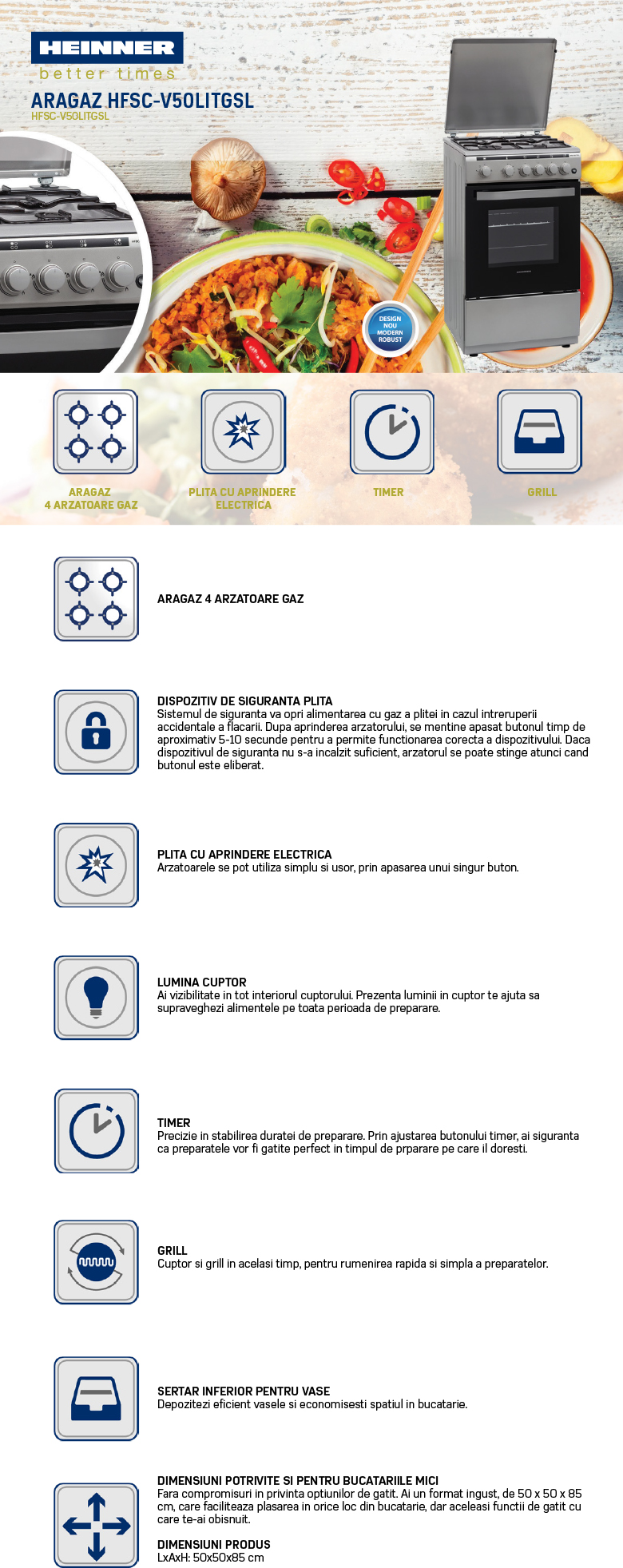 Aragaz Heinner HFSC-V50LITGSL, 4 arzatoare, Gaz + GPL, Aprindere electrica, Timer, Grill, 50 cm, Argintiu