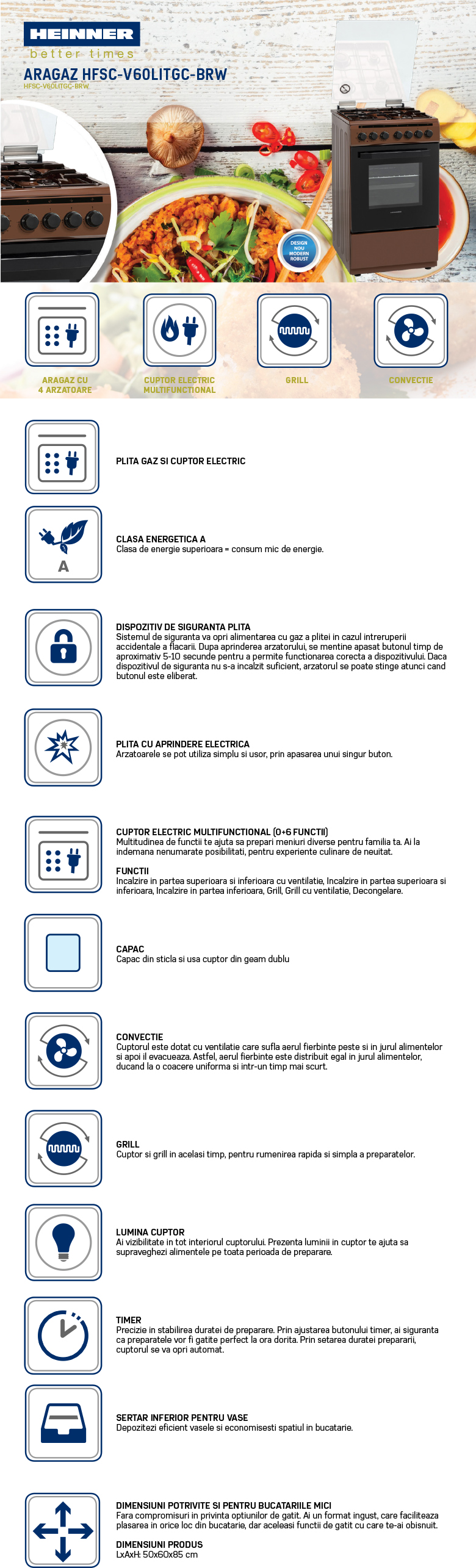 Heinner Aragaz Mixt Heinner HFSC-V60LITGC-BRW, 50x60cm, 4 arzatoare, Suport email, Capac sticla, Aprindere electrica plita, Cuptor electric, 6 functii, Timer, Grill, GPL + GAZ, Culoare: Maro