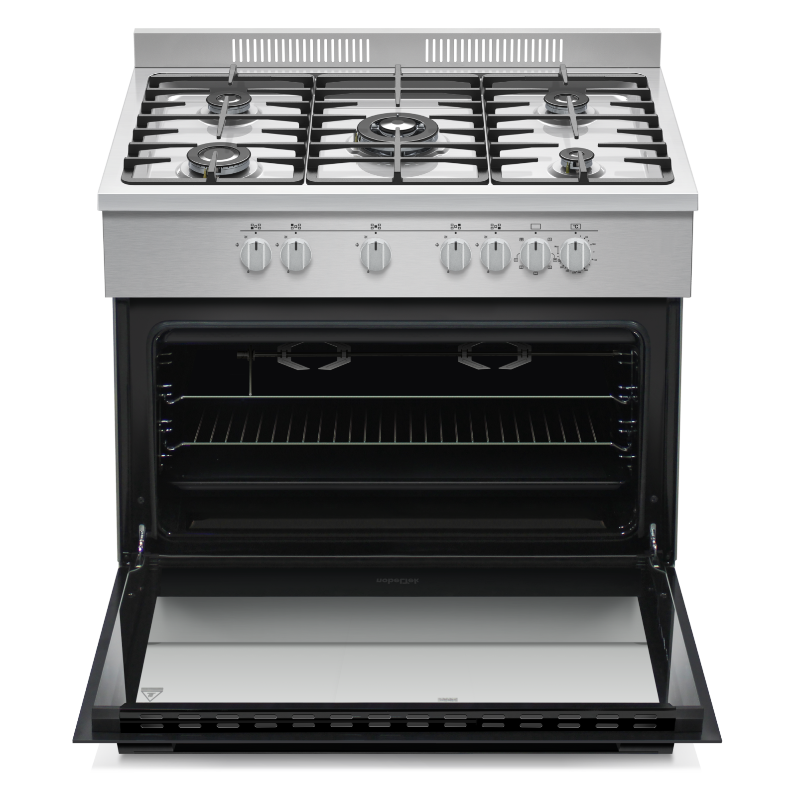 Aragaz semi-profesional Nobeltek NLT SP6904IX/FE1, plita gaz cu 5 ochiuri(arzator mare triplu), cuptor electric (110l), aprindere electrica, grill, iluminare cuptor, rotisor, gratare fonta