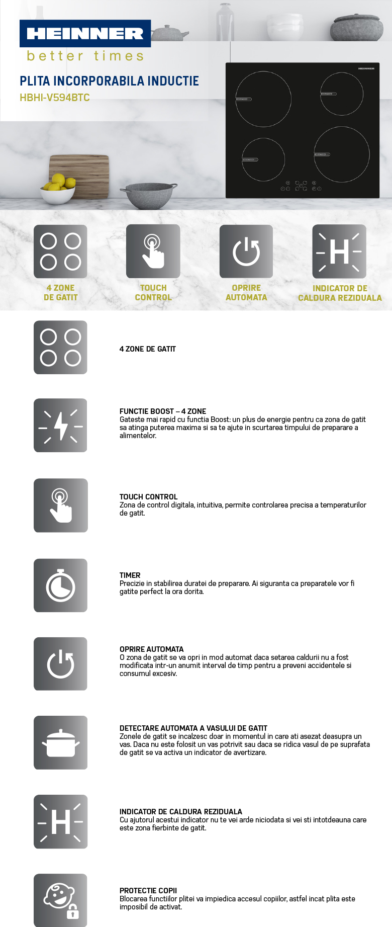 Plita cu inductie incorporabila Heinner HBHI-V594BTC, 4 zone de gatit, Touch control, Boost 4 zone, 60 cm, Sticla neagra