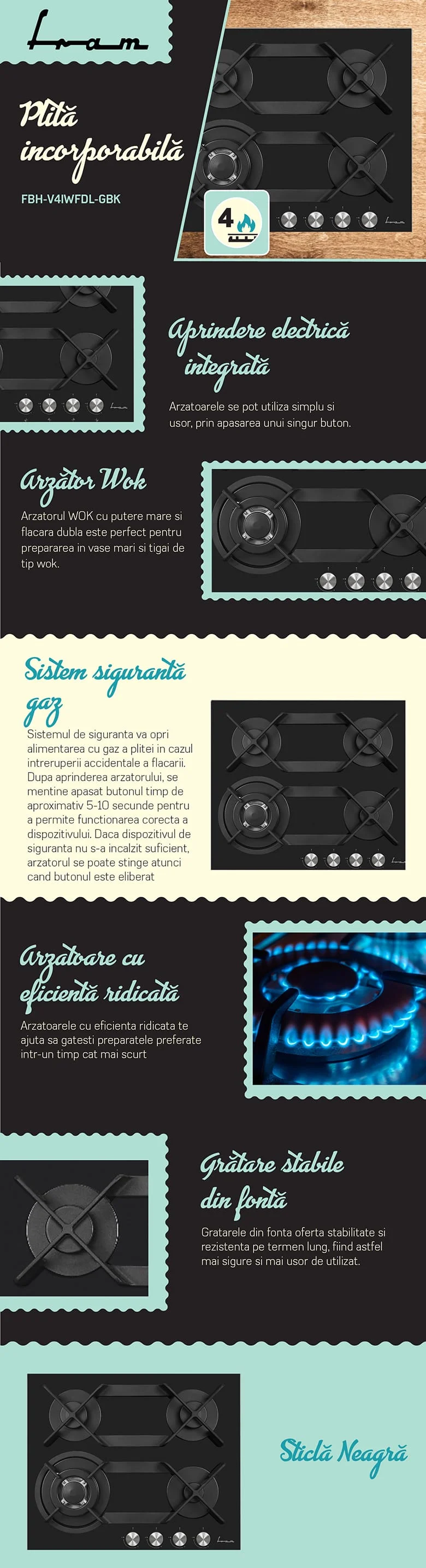 Plita incorporabila Fram FBH-V4IWFDL-GBK, 4 arzatoare, Wok, Gratar fonta, Aaprindere electrica, Dispozitiv de siguranta, 60 cm, Sticla neagra