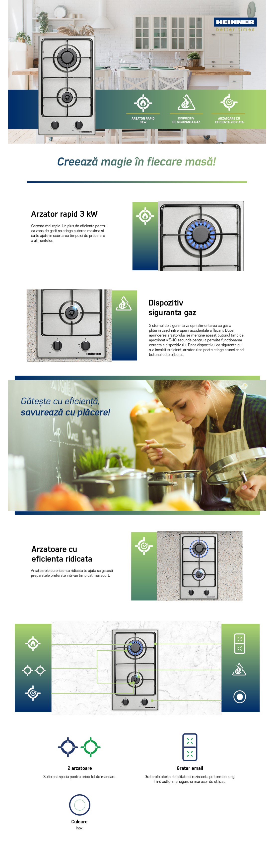 Heinner Plita incorporabila Heinner HBH-V302EIX, Gaz, 2 arzatoare, Dispozitiv de siguranta, 30 cm, Inox