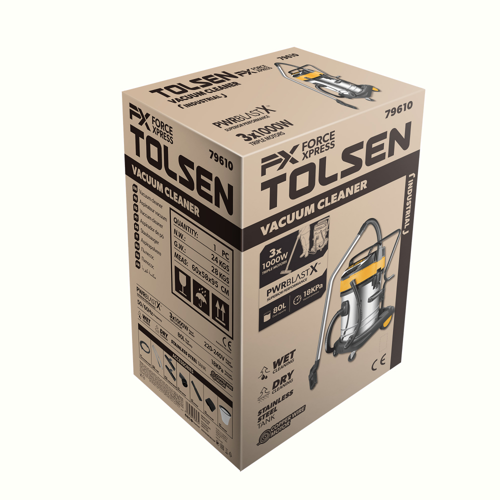 Aspiratorul TOLSEN FX Force Xpress este o solutie profesionala puternica pentru curatarea umeda si uscata in medii industriale si comerciale. Echipat cu 3 motoare independente de 1000W cu fir din cupru si un rezervor robust de 80L din otel inoxidabil, asigura performanta maxima si fiabilitate in cele mai solicitante sarcini.