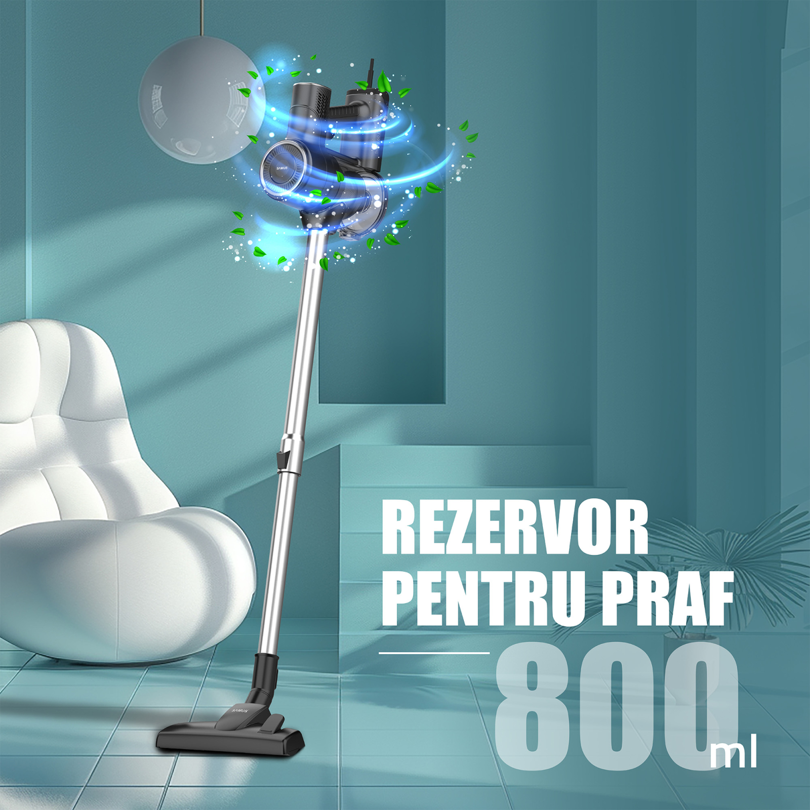 Recipientul de colectare al prafului are o capacitate de colectare de 800 ml. Astfel, poti aspira fara griji intreaga casa, urmand a goli recipientul dupa finalizarea procesului de curatenie.
