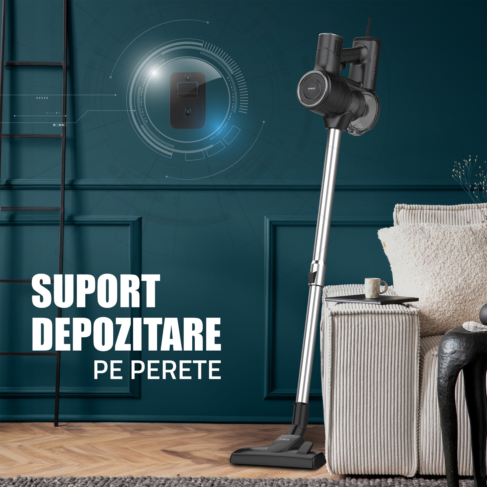 Stai fara grija depozitarii aspiratorului. Datorita suportului inclus, ii alegi rapid locul, il montezi si il depozitezi usor si rapid.
