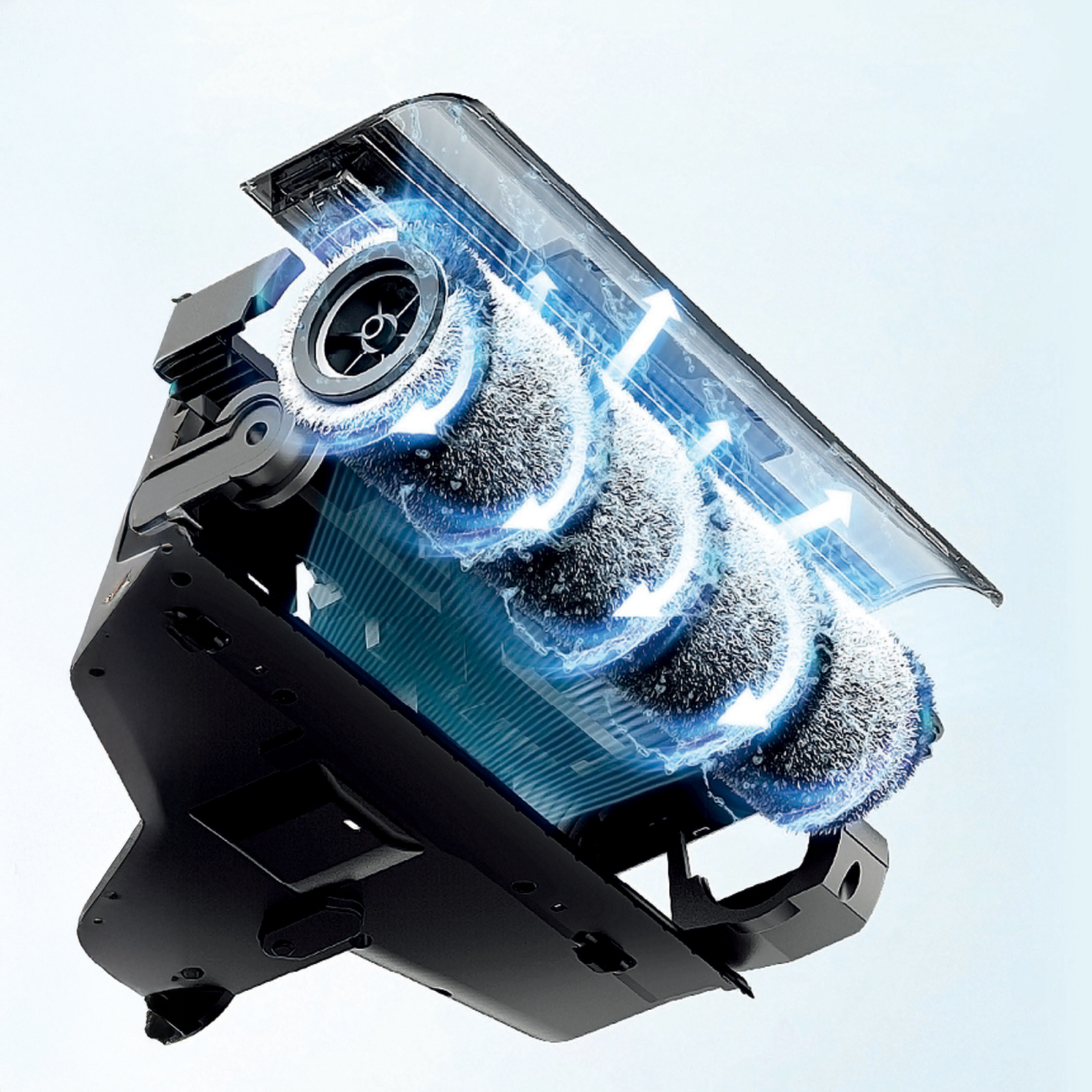 Din rezervorul de apa curata se furnizeaza apa electrolizata pe un canal dedicat iar murdaria este preluata instantaneu de peria rotativa si dirijata, pe un al canal, in rezervorul de apa murdara.