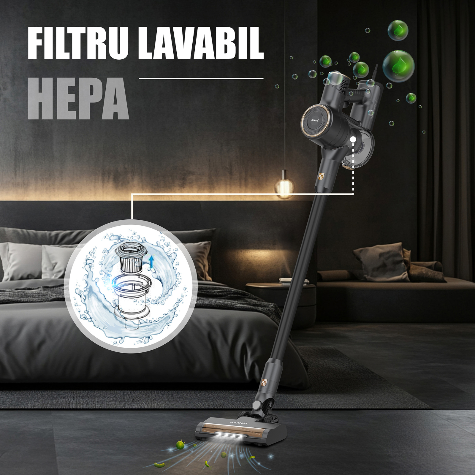 Filtru Hepa al aspiratorului ajuta ca protectie pentru motor, capteaza si cele mai fine particule de praf, lasand un aer mai curat si mai sanatos. Acest lucru semnifica un avantaj mare mai ales pentru persoanele cu alergii.