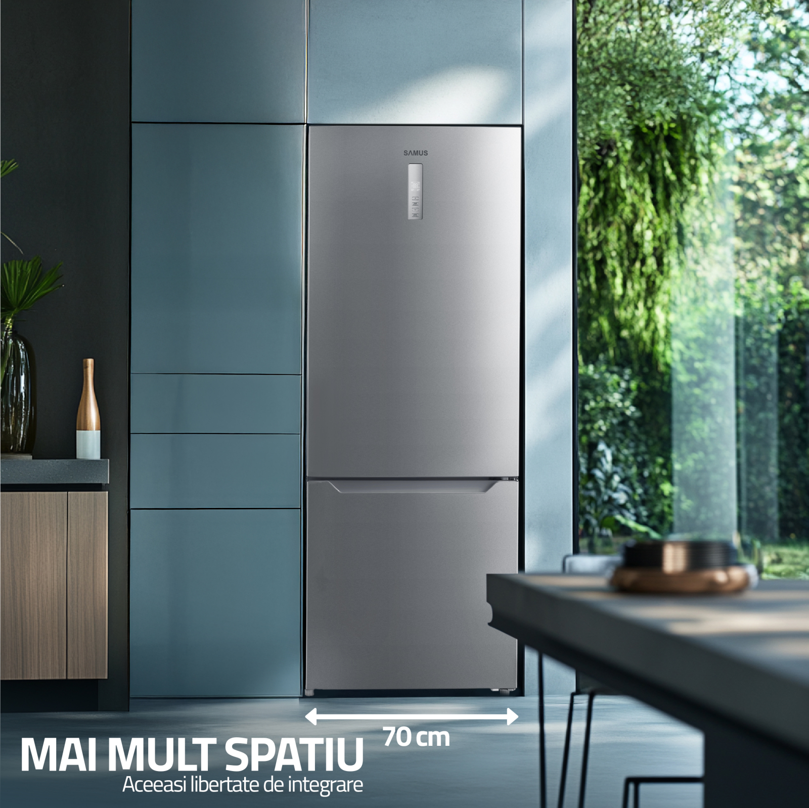 Combina frigorifica Samus are o latime de 70 cm, oferind un volum interior semnificativ mai mare fata de modelele standard (care au, in general, 60 cm latime). Diferenta de spatiu este ideala pentru familii numeroase sau pentru cei care fac cumparaturi mai rar, dar in cantitati mai mari. Totodata, combina pastreaza un format compact, fiind usor de integrat in majoritatea bucatariilor moderne. Nu necesita modificari majore de mobilier sau configuratie, oferind un echilibru excelent intre dimensiune exterioara si capacitate interioara.