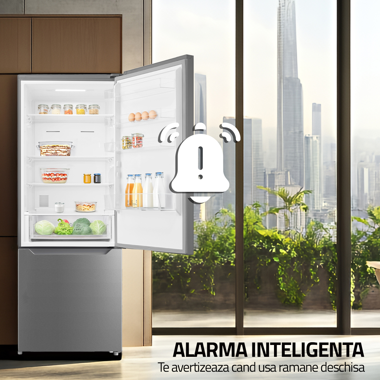 Combina frigorifica Samus este echipata cu functia inteligenta Alarma Usa Deschisa, conceputa pentru a proteja alimentele si a reduce consumul de energie. Daca usa ramane deschisa prea mult timp, un semnal sonor te va avertiza imediat, prevenind pierderile de aer rece si posibilele deteriorari ale produselor din interior.