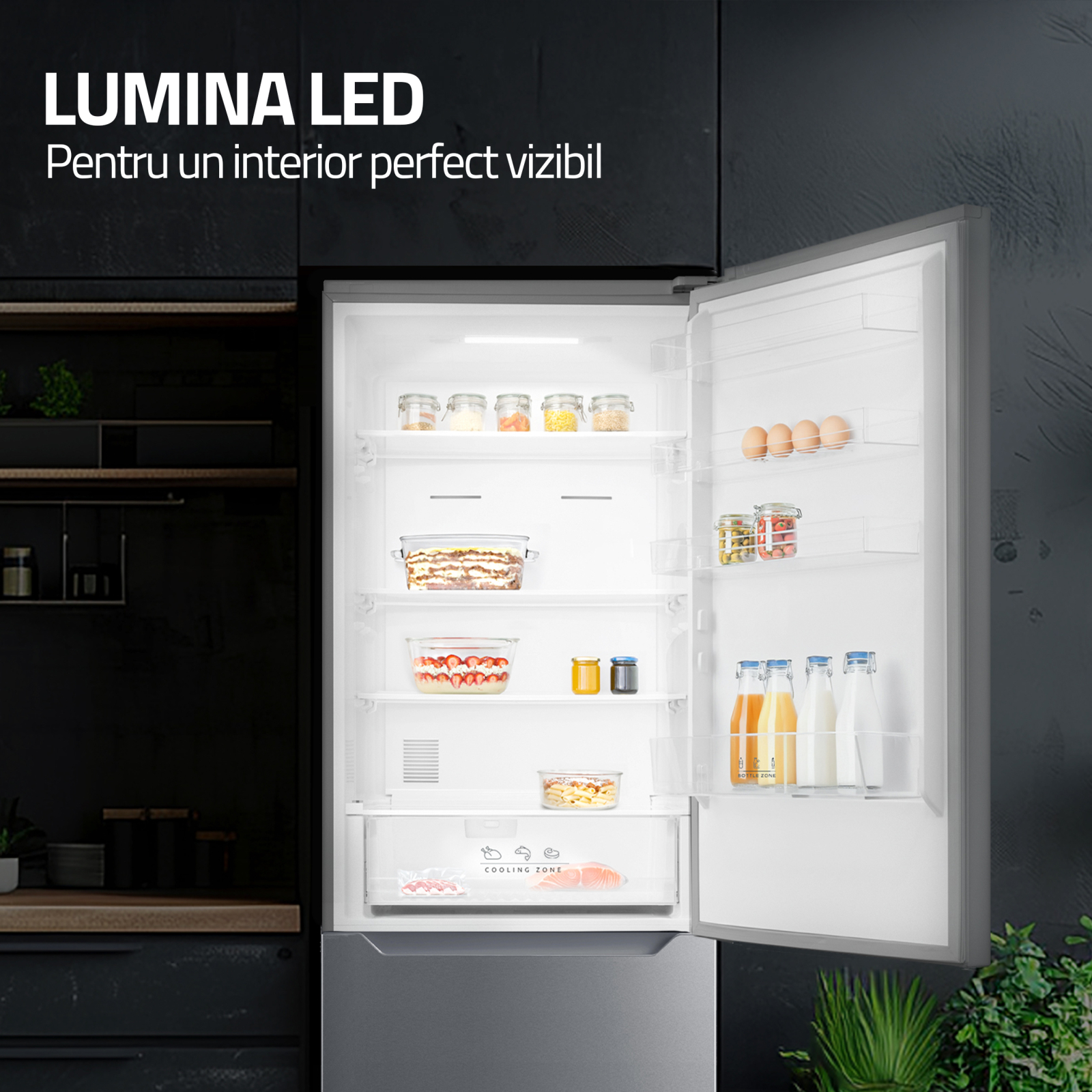 Ai tot timpul alimentele la vedere. Becul LED situat în partea superioara asigura vizibilitate maxima în orice colt al frigiderului.