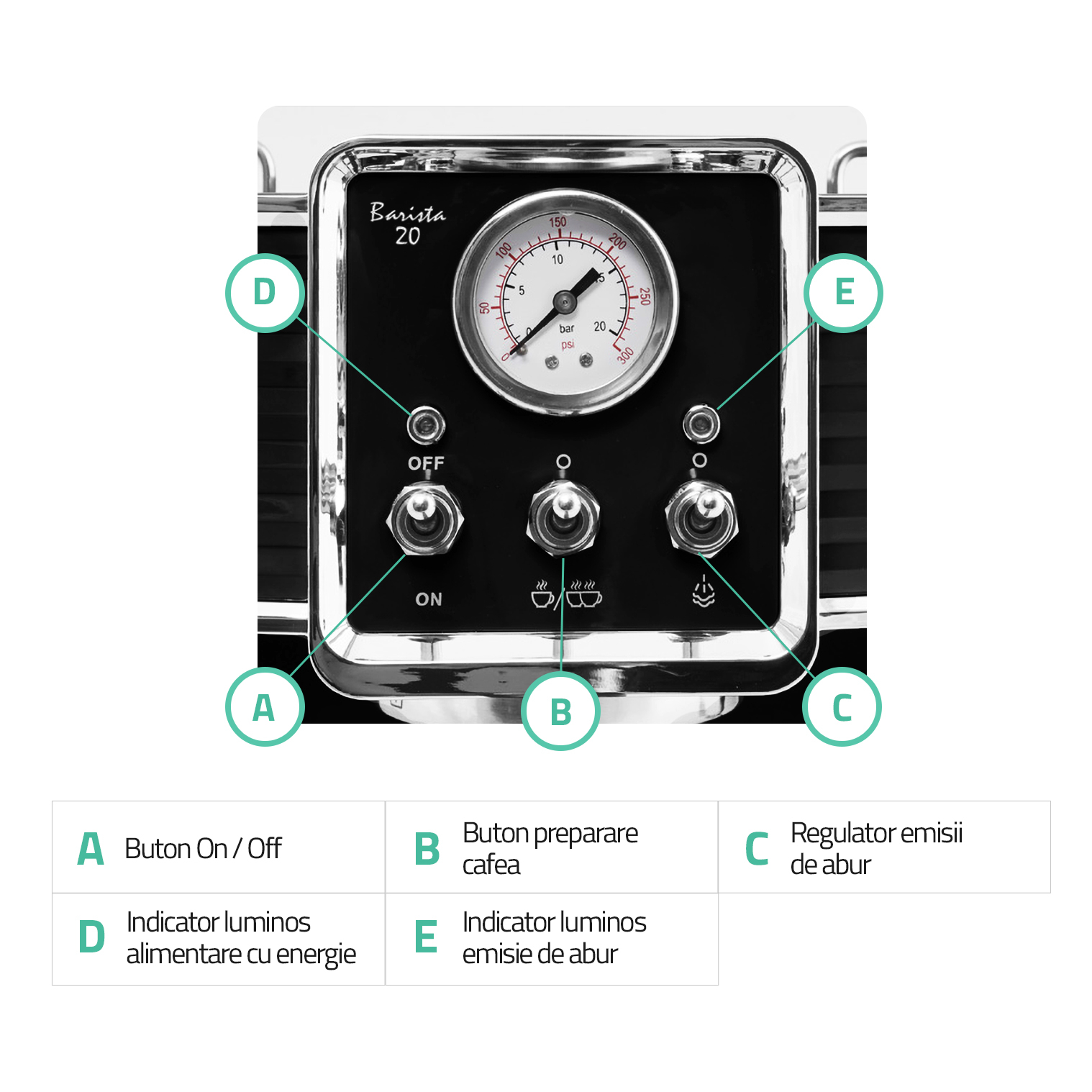 Intreaga aroma a cafelei macinate va fi extrasa direct in ceasca ta datorita presiunii ridicate de 20 bari a pompei. Vei avea tot timpul parte de o cafea aromata si cremoasa ca la cafenele!