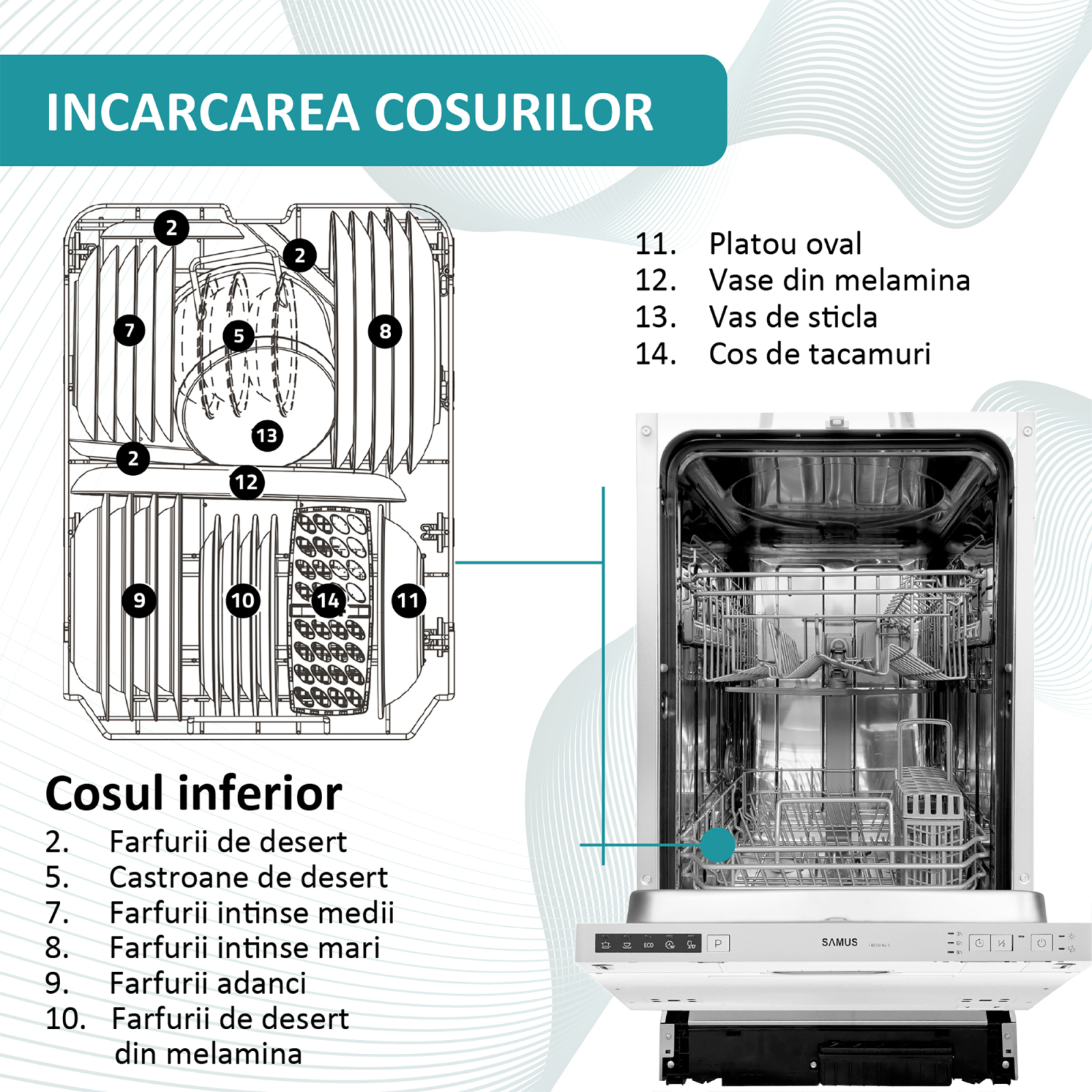 Tacamurile se vor spala bine si in siguranta datorita cosului special din dotarea masinii de spalat vase Samus