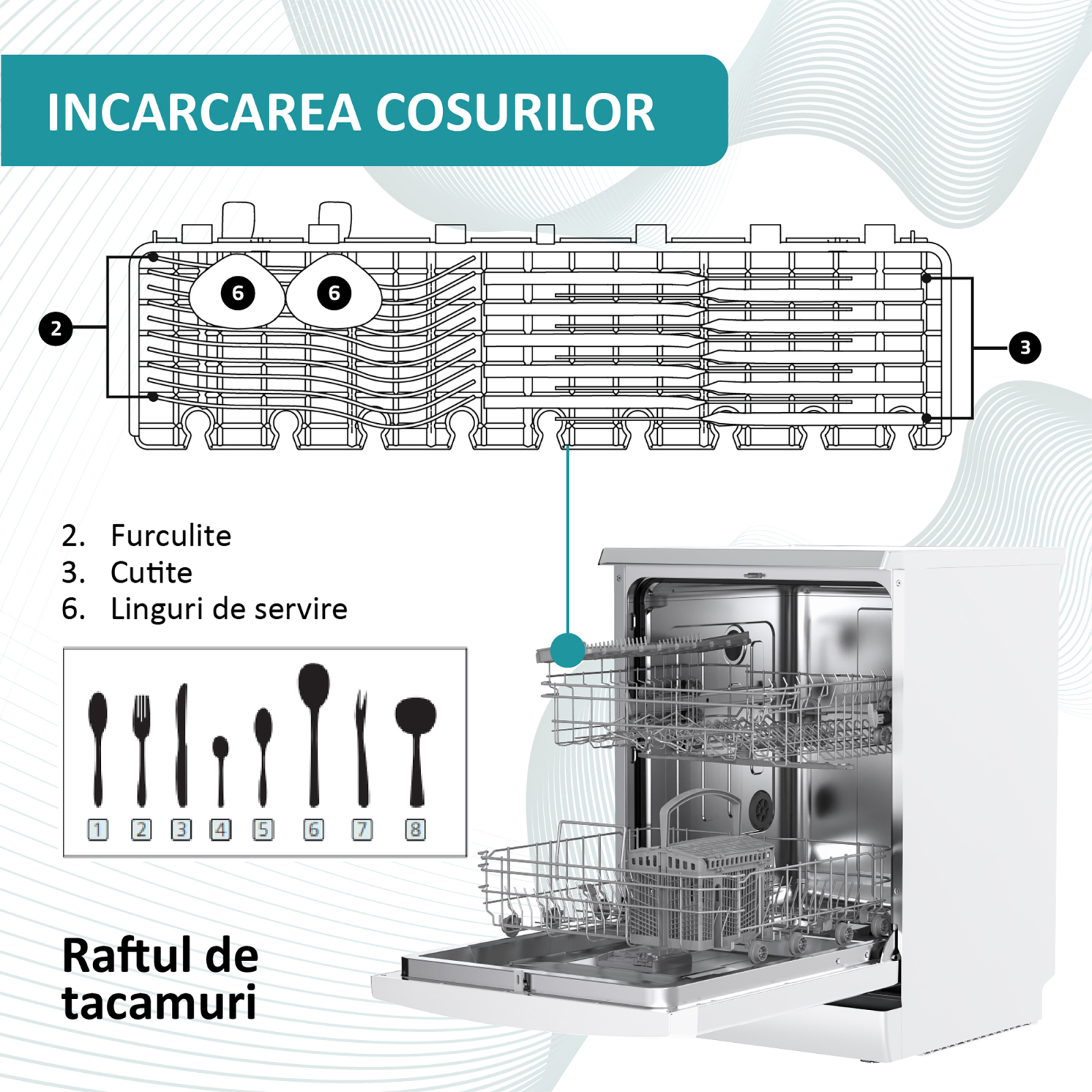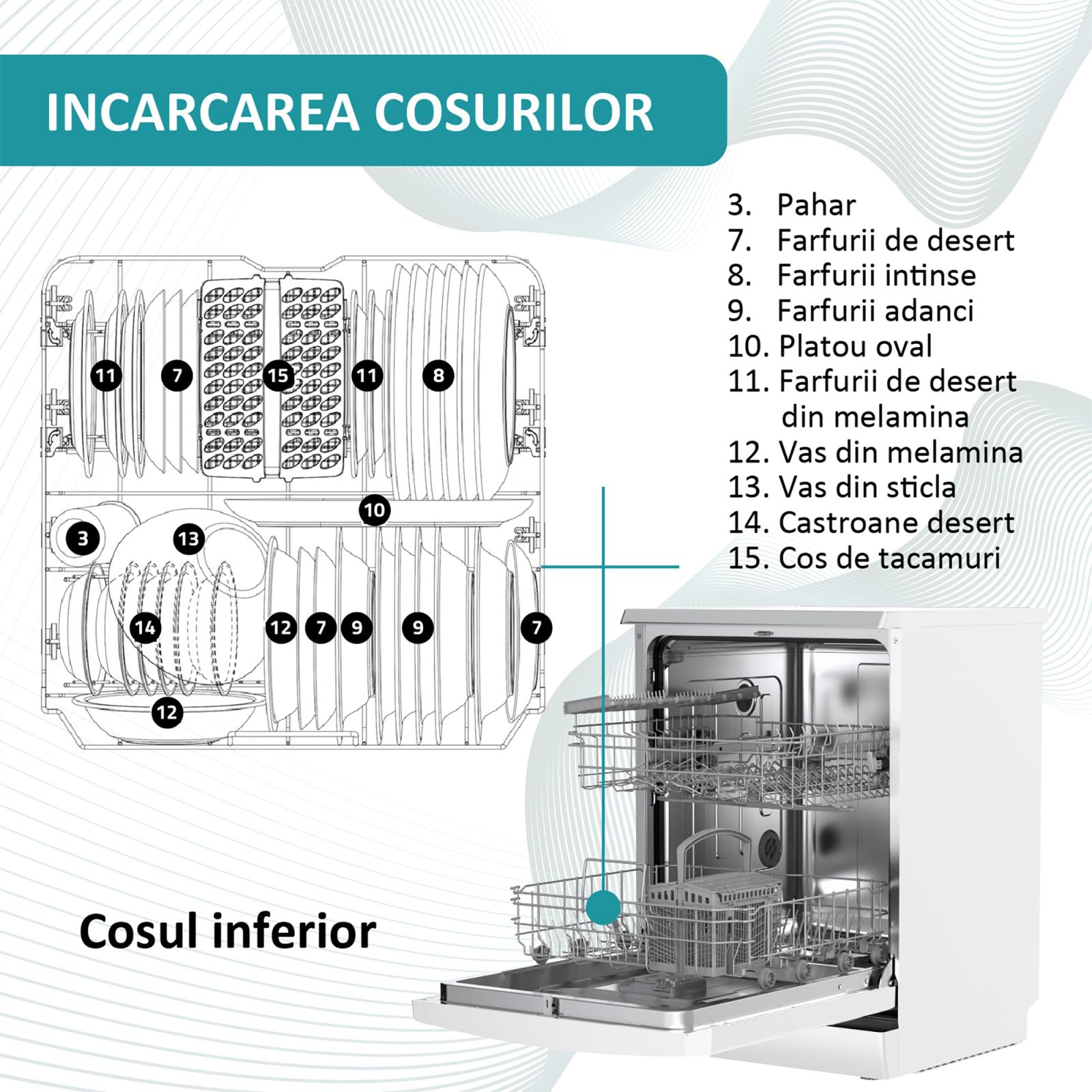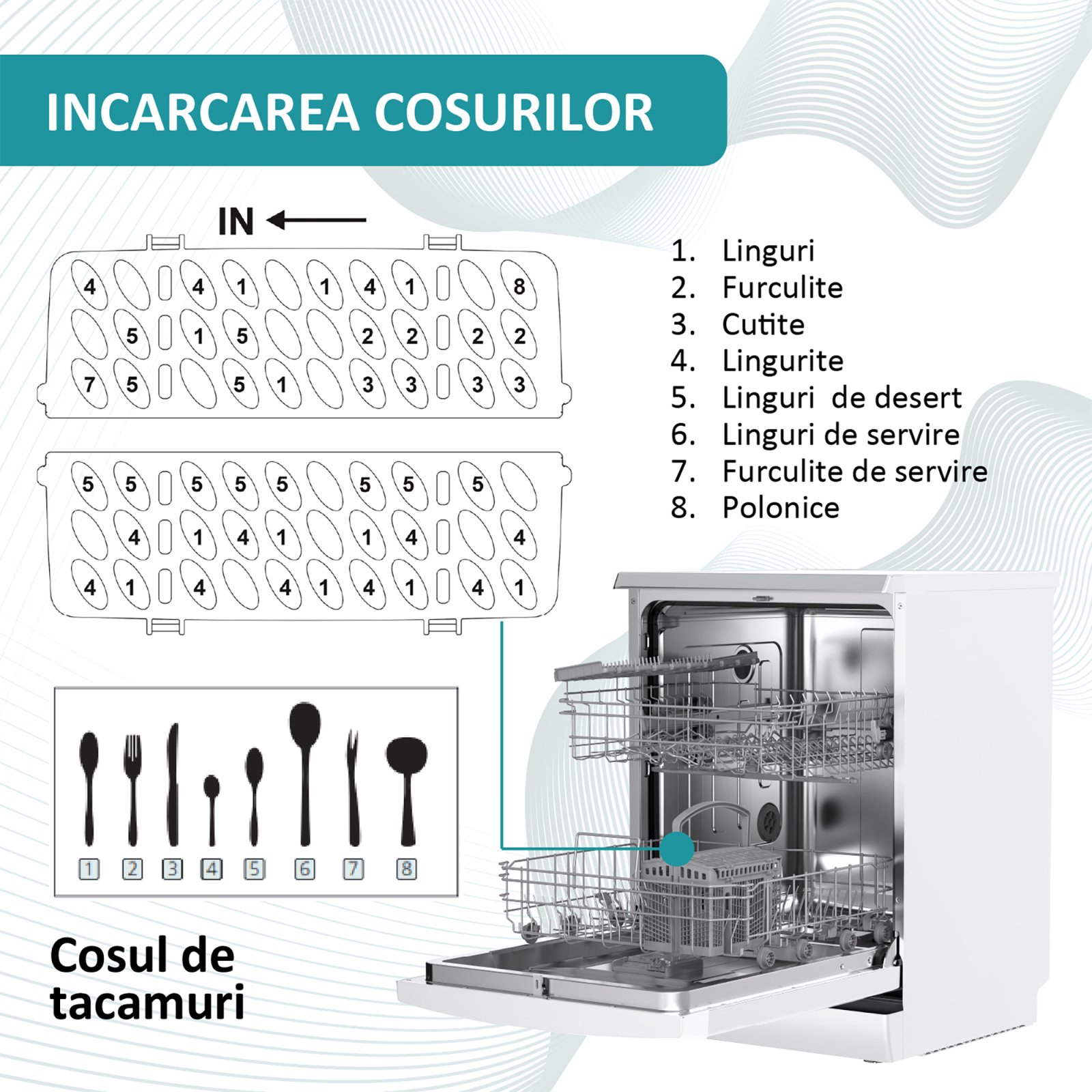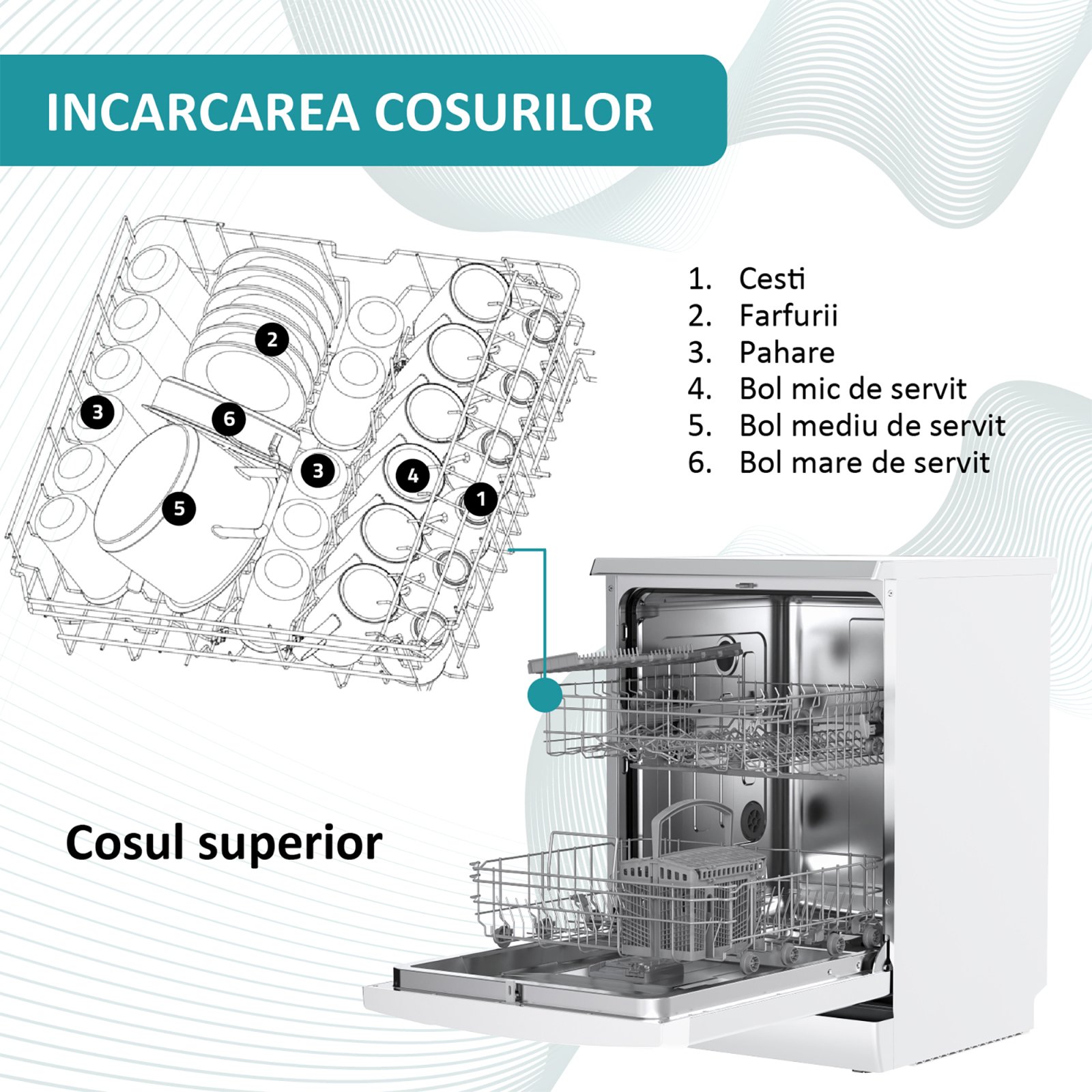 Farfurii, oale, cani, pahare. Toate se vor spala in siguranta datorita celor doua cosuri din dotare, cu compartimente speciale pentru fiecare vas in parte