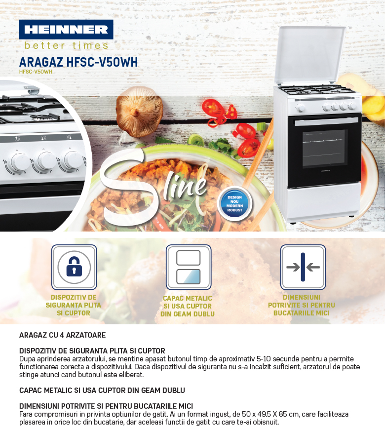 Pachet - Aragaz Heinner HFSC-V50WH, 4 arzatoare, Gaz, 50 cm, Alb + Hota Heinner HTCH-F400IX, Putere de absorbtie 358.4 mc/h, 1 motor, 60 cm, Inox