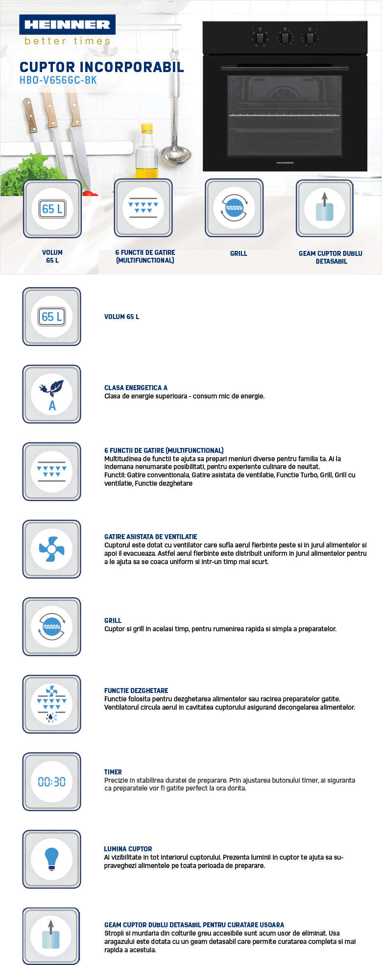 Pachet - Cuptor Incorporabil HEINNER HBO-V656GC-BK, 70 L, Geam dublu, 6 functii + Plită Incorporabilă HEINNER HBH-M452IWFGBK + Hota Decorativă HEINNER DCH-350RGBK, absorbție 276.6 m³/h, 60 cm