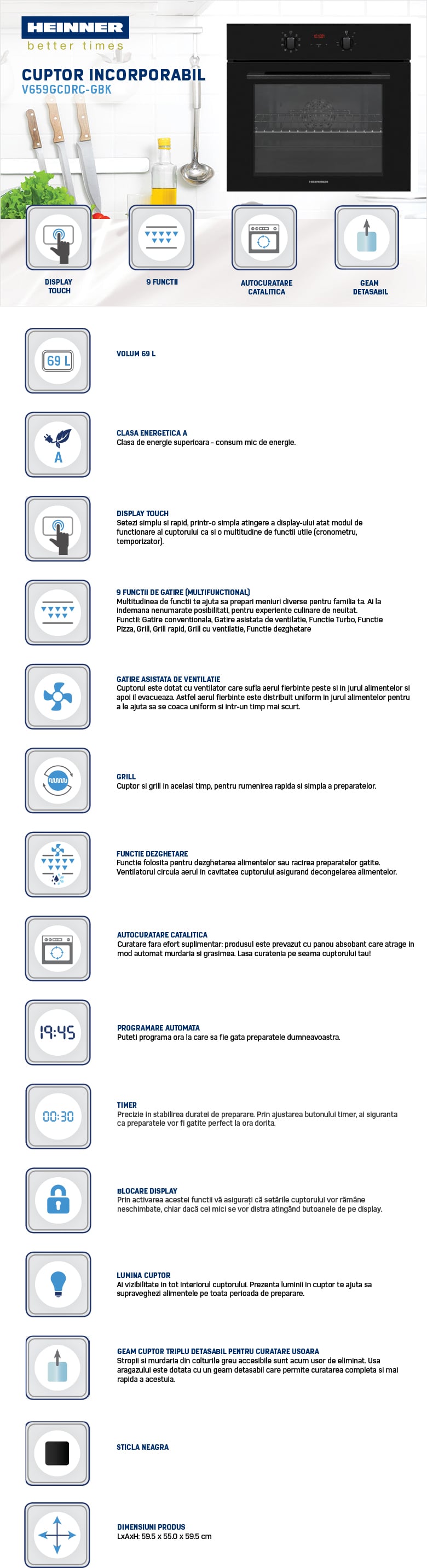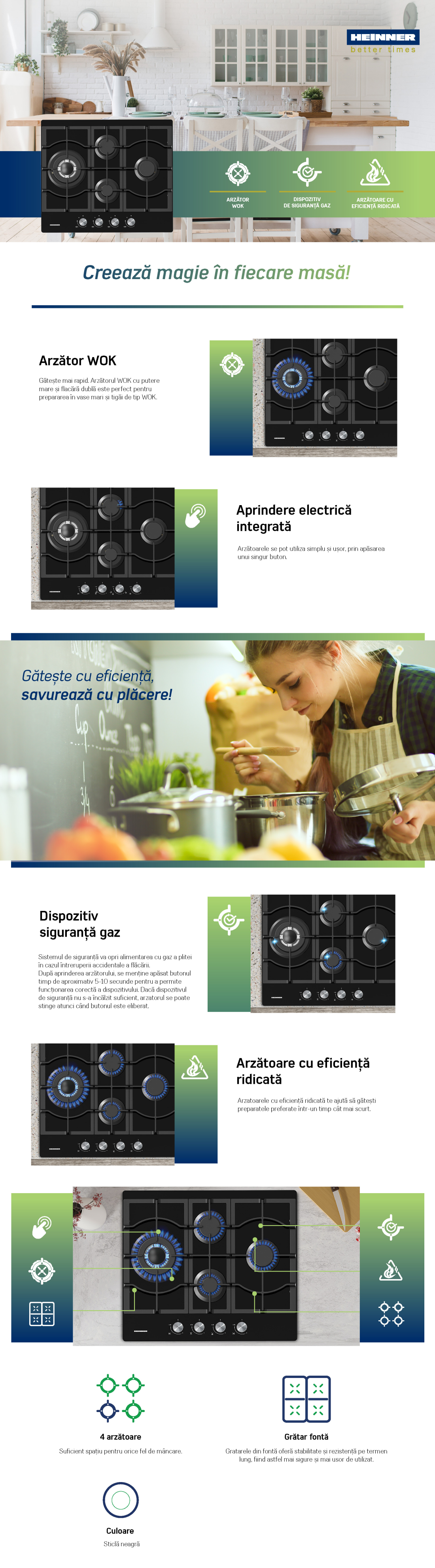 Pachet - Cuptor Incorporabil HEINNER HBO-V659GCDRC-GBK, 70 L, 9 functii + Plită Incorporabilă HEINNER HBH-M452IWFGBK + Hota Decorativă HEINNER DCH-350RGBK, absorbție 276.6 m³/h, 60 cm