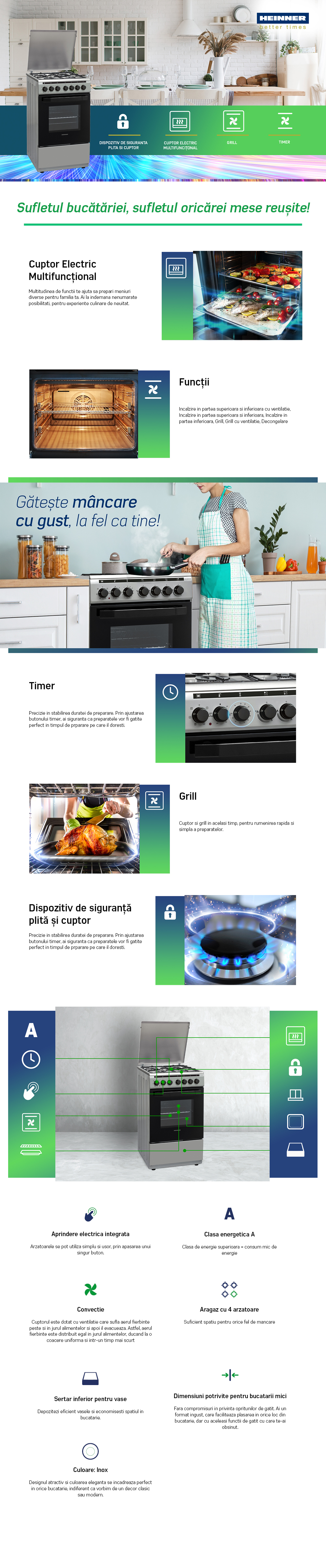 Aragaz mixt Heinner HFSC-V60LITGC-SS, 4 arzatoare gaz, Dispozitiv de siguranta plita, Aprindere electrica, GPL + GAZ, Cuptor electric, Timer, Grill, Clasa A, 50 cm + Butelie GPL 26 L