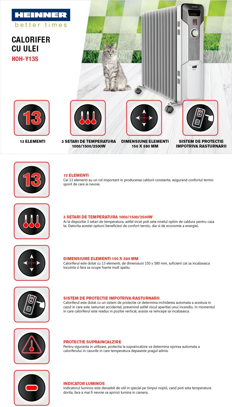 Calorifer electric cu ulei Heinner HOH-Y13S, 2500 W, 13 elementi, supraincalzire, termostat reglabil, alb