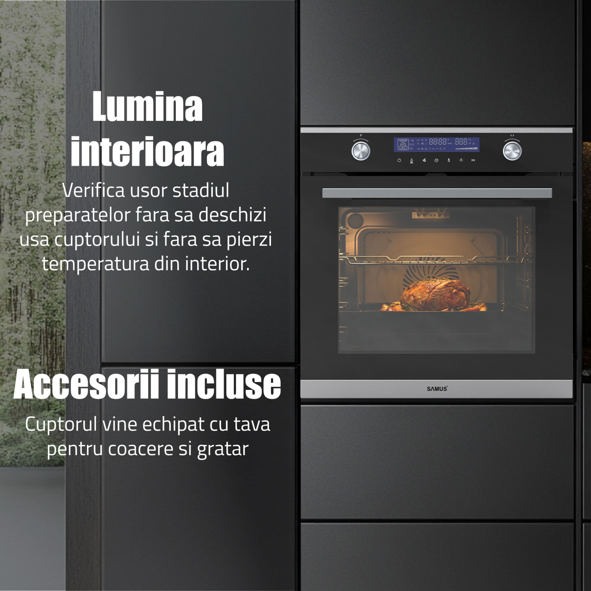 Vezi tot timpul in ce stadiu se afla preparatele tale fara a deschide usa la cuptor. Acesta are iluminare interioara, iar tu ai acces facil la interior, fara nici cel mai mic efort. Sa obtii reteta perfecta e mai usor ca niciodata cu ajutorul cuptorului incorporabil Samus. Cuptorul vine la pachet cu cateva accesorii care nu ar trebui sa lipseasca din bucataria ta. Tava pentru coacere si  gratarul sunt ideale pentru preparatele tale si pentru a obtine mancarea dorita cu mai putin ulei.