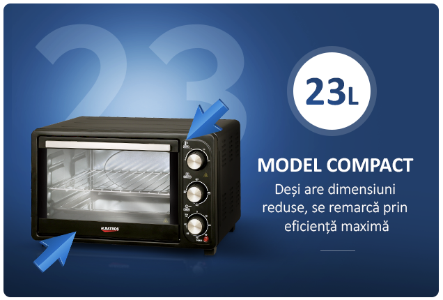 Desi are dimensiuni reduse, cuptorul Albatros se remarca prin eficienta maxima. Cu un volum de 18 L si o putere de 1380 W, acesta poate fi solutia ideala atunci cand vrei sa incalzesti mancarea, sa prepari cele mai delicioase sandwich-uri si prajituri sau sa prepari o cina perfecta pentru doua persoane.
