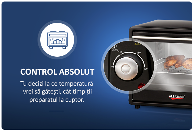 Tu decizi la ce temperatura vrei sa gatesti, cat timp tii preparatul la cuptor si ce program vrei sa folosesti! Cuptorul electric Albatros A23B2 este dotat cu functia de reglare a temperaturii, pe care o poti seta intre 90 si 230 de grade, iar functia “Timer” iti lasa posibilitatea de a alege timpul de gatire intre 1 – 60 de minute.