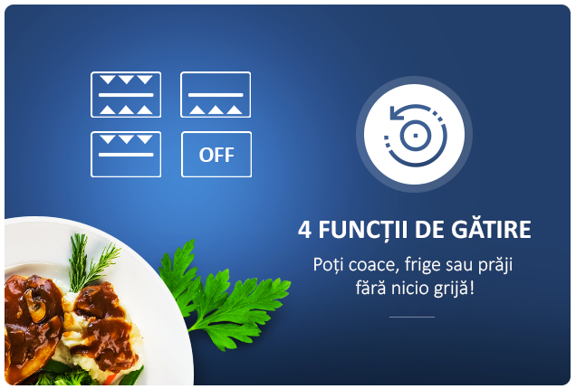Poti coace, frige sau praji fara nicio grija! Cuptorul electric are 4 programe disponibile iar tu il poti alege pe cel de care ai nevoie in functie de preparatele pe care doresti sa le faci.