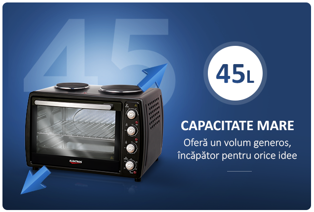 Indiferent de dorinte, cuptorul electric Albatros A45BP2 va fi aliatul tau de nadejde! Acesta este alegerea ideala pentru a crea mancaruri speciale, inventive si delicioase pentru tine si familia ta! De culoare neagra si cu design modern, isi va gasi rapid locul in bucataria ta.