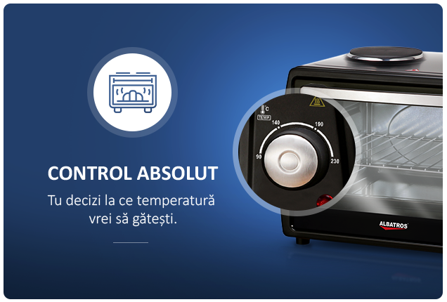 Tu decizi la ce temperatura vrei sa gatesti si ce program vrei sa folosesti! Cuptorul electric Albatros A45BP2 este dotat cu functia de reglare a temperaturii, pe care o poti seta intre 90 si 230 de grade, in functie de ceea ce vrei sa gatesti.