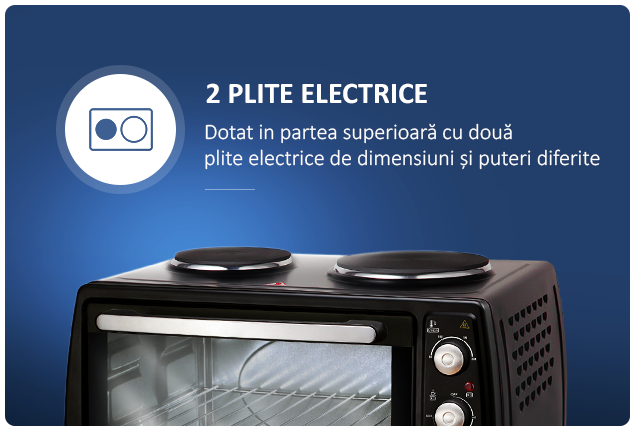 Cuptor Electric Albatros A45BP2 – 45L, 3500W (1800W Cuptor + 2 Plite 700W/1000W), Geam Dublu, Rezistență Sus/Jos, Control Temperatură 90–230°C, Culoare Neagră