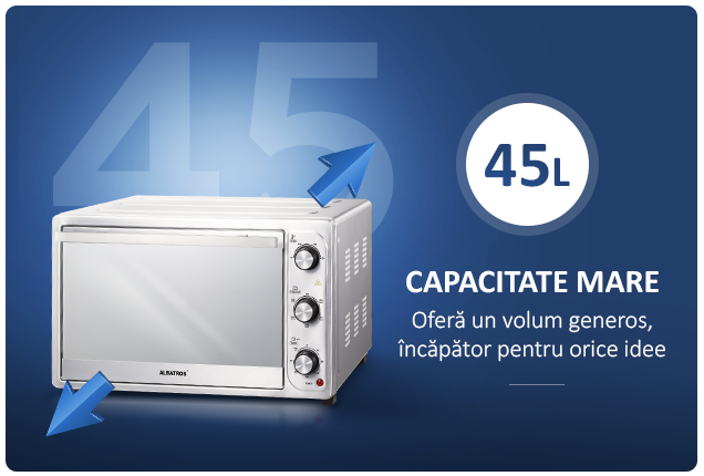 Capacitatea de 45 de litri iti ofera un volum generos, incapator pentru orice idee, pentru a prepara mancaruri delicioase pentru tine si cei dragi.