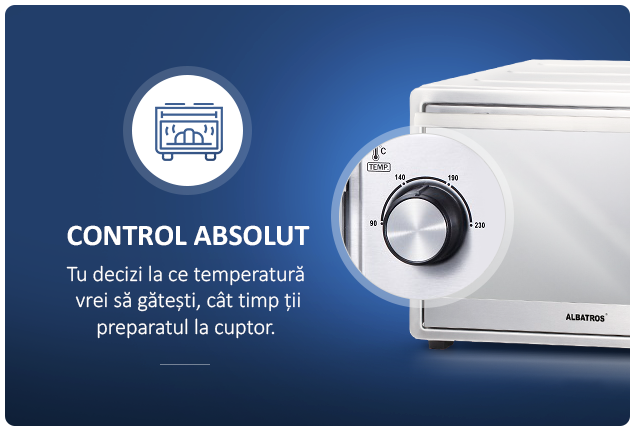 Tu decizi la ce temperatura vrei sa gatesti, cat timp tii preparatul la cuptor si ce program vrei sa folosesti! Cuptorul electric Albatros A45CRX2 este dotat cu functia de reglare a temperaturii, pe care o poti seta intre 90 si 230 de grade, iar functia “Timer” iti lasa posibilitatea de a alege timpul de gatire intre 1 – 60 de minute.