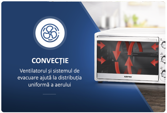 Cuptorul Albatros vine dotat cu un ventilator si un sistem de evacuare care ajuta la distributia uniforma a aerului fierbinte in jurul alimentelor, asigurand: o gatire mai rapida, uniforma, o rumenire mai frumoasa si o economisire a energiei de pana la 25%.