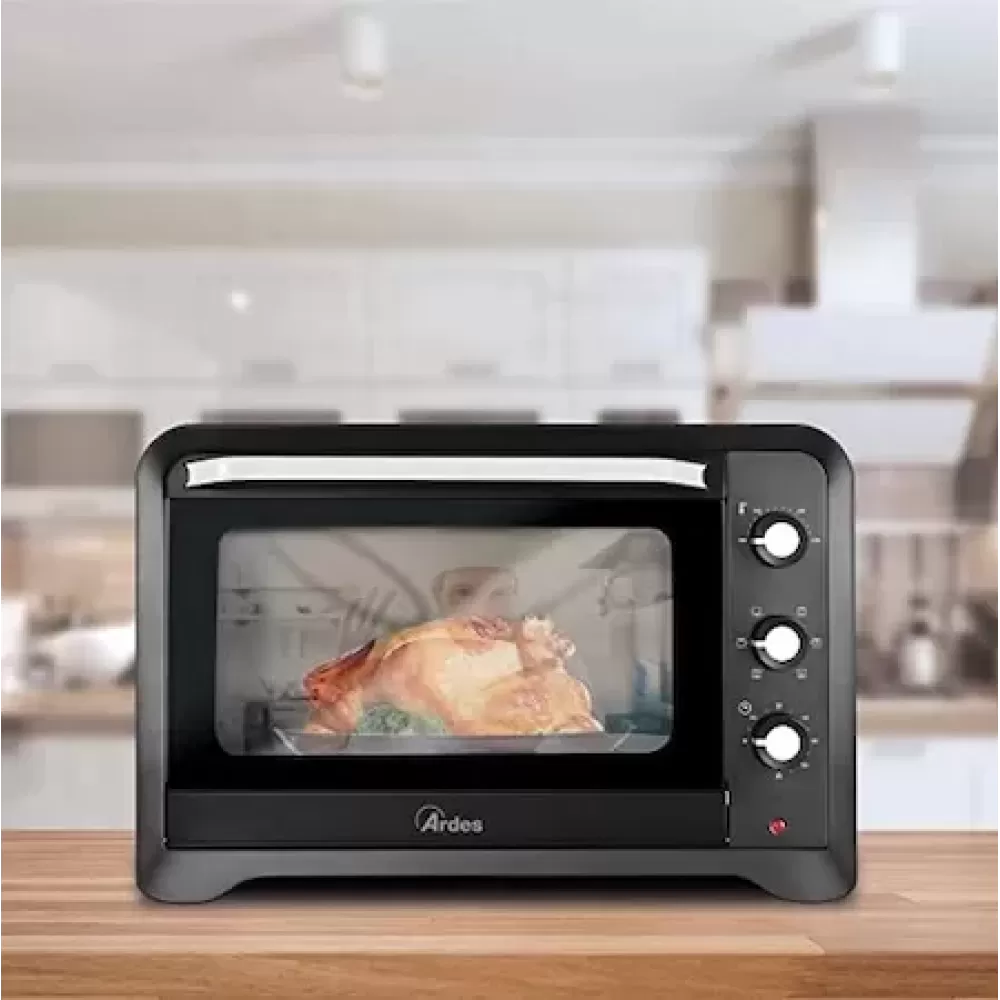 Acest cuptor este o alternativa excelenta la cuptorul incorporabil. Design premium, modern si elegant. Termostat cu mai multe pozitii, reglabil de la 100° pana la 230° C. 6 functii de gatit: sus, jos, sus + jos, sus + ventilatie, jos + ventilatie, sus + jos + ventilatie. Cronometru de 60 de minute cu oprire automata si semnal acustic de sfarsit de gatit. Functiile diferite il fac versatil si simplu de utilizat. Functia de ventilatie permite gatirea mai rapida si mai uniforma a alimentelor, ceea ce lasa alimentele parfumate (isi pastreaza mirosul placut) la exterior si mai umede in interior. Cuptorul static, in schimb, produce o gatire mai lenta si mai delicata, ideala pentru obtinerea de preparate bine gatite si uscate chiar si in interior. Usa dubla din sticla. Lampa pilot.