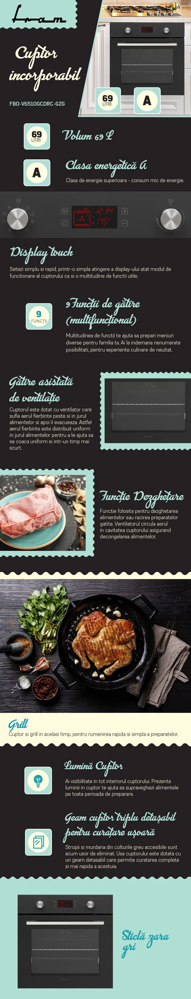 Cuptor incorporabil Fram FBO-V6510GCDRC-GZG, Electric, Autocuratare catalitica, Clasa A, Timer digital, Display touch+Butoane, Grill, Iluminare, Blocare display, Sticla gri zara