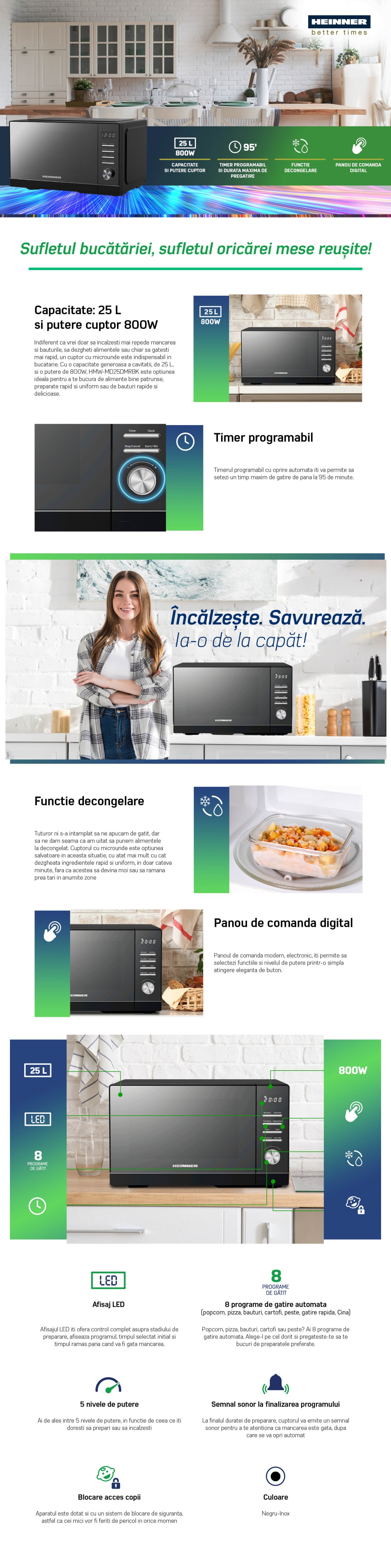 Cuptor cu microunde Heinner HMW-MD25DMRBK, 25L, geam oglinda, 800W, 5 trepte de putere, timer, functie decongelare, negru