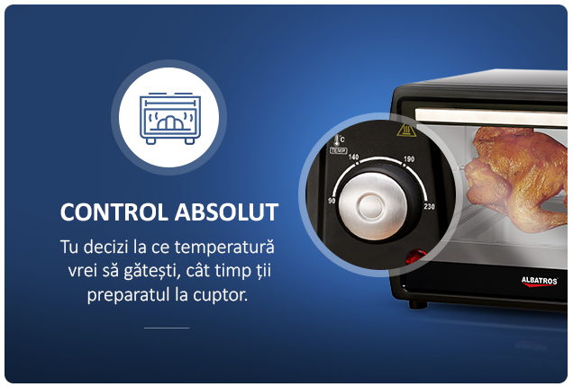 Tu decizi la ce temperatura vrei sa gatesti, cat timp tii preparatul la cuptor si ce program vrei sa folosesti! Cuptorul electric Albatros A63BRC2 este dotat cu functia de reglare a temperaturii, pe care o poti seta intre 90 si 230 de grade, iar functia ‘Timer’ iti permite sa alegi timpul de gatire intre 1 si 60 de minute. In plus, cuptorul dispune de avertizare sonora la terminarea programului, asa ca, indiferent ce faci in acel moment, vei sti exact cand preparatul tau este gata.