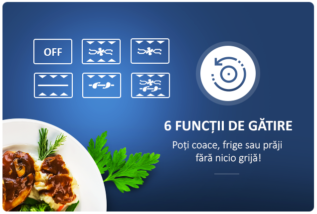 Dintre numeroasele modalitati de a pregati masa, rotiseria ocupa un loc fruntas. Cuptorul Albatros vine cu functia de rotisare incorporata, asigurand o gatire uniforma a carnii.